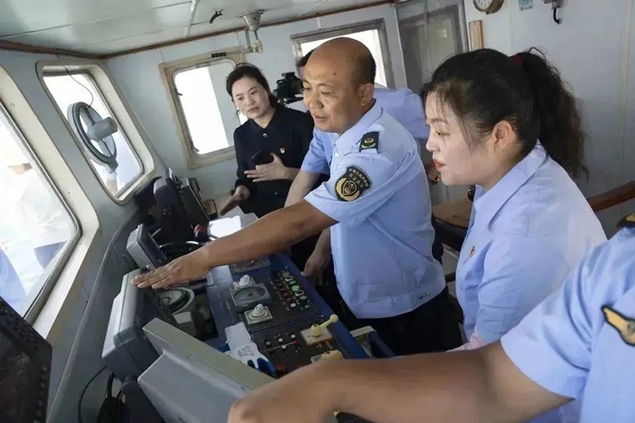 與以往不同,本次主題黨日活動登上漁政37605執法船。正值禁漁期執法階段,黨員代表們隨漁政執法人員一起,出海巡航,沉浸式體驗海上執法,感受海上執法的艱辛與不易。
